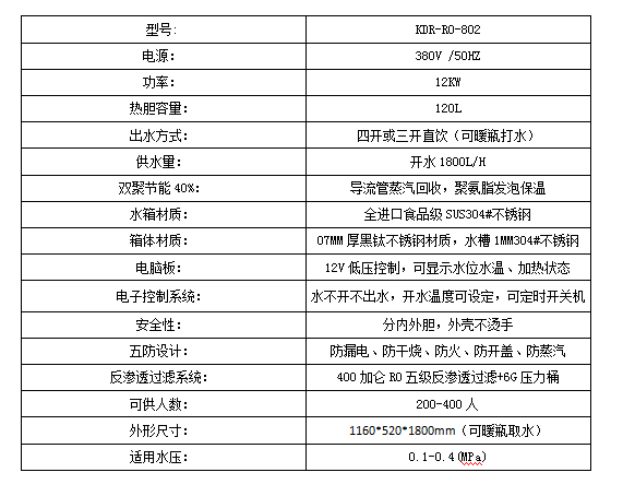 科蒂洛KDR-RO-802-B步進式開水器,采用國際領(lǐng)先逆滲透技術(shù),運用五級凈化工藝,可以輕松濾除水中的離子、細(xì)菌、鐵銹、泥沙、余氯、膠體、有機物、重金屬等物質(zhì)。凈化之后的水質(zhì)優(yōu)于國家標(biāo)準(zhǔn)《瓶裝飲用純凈水》(GB-17323-1998)。